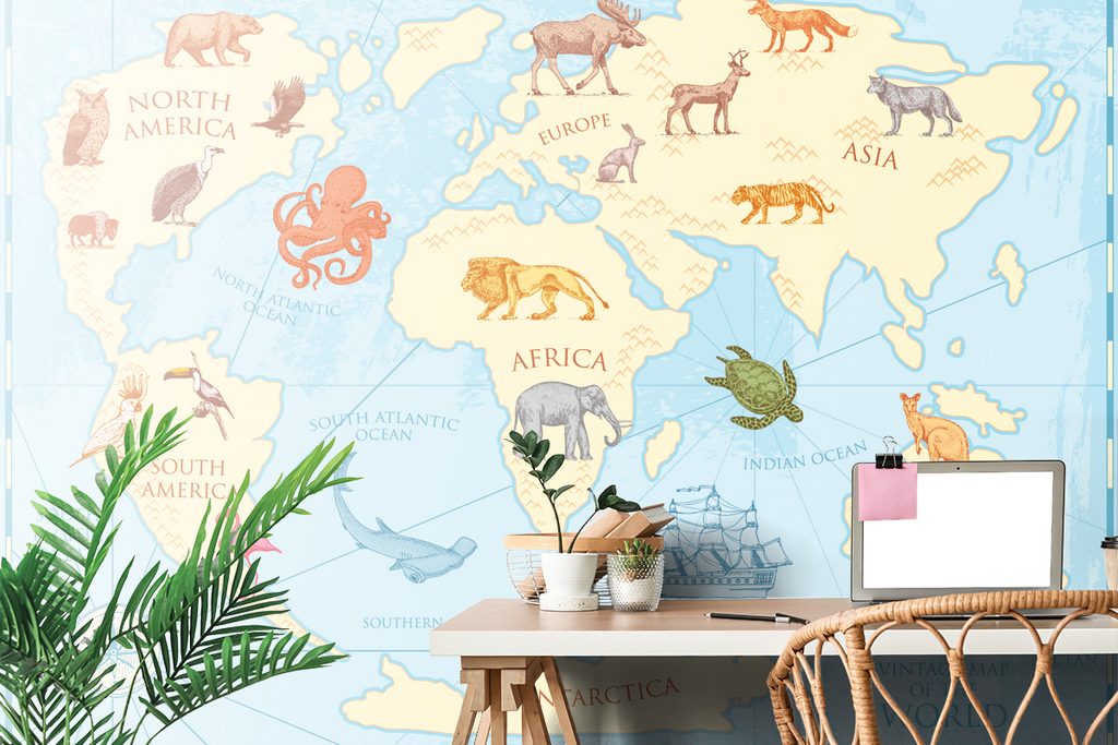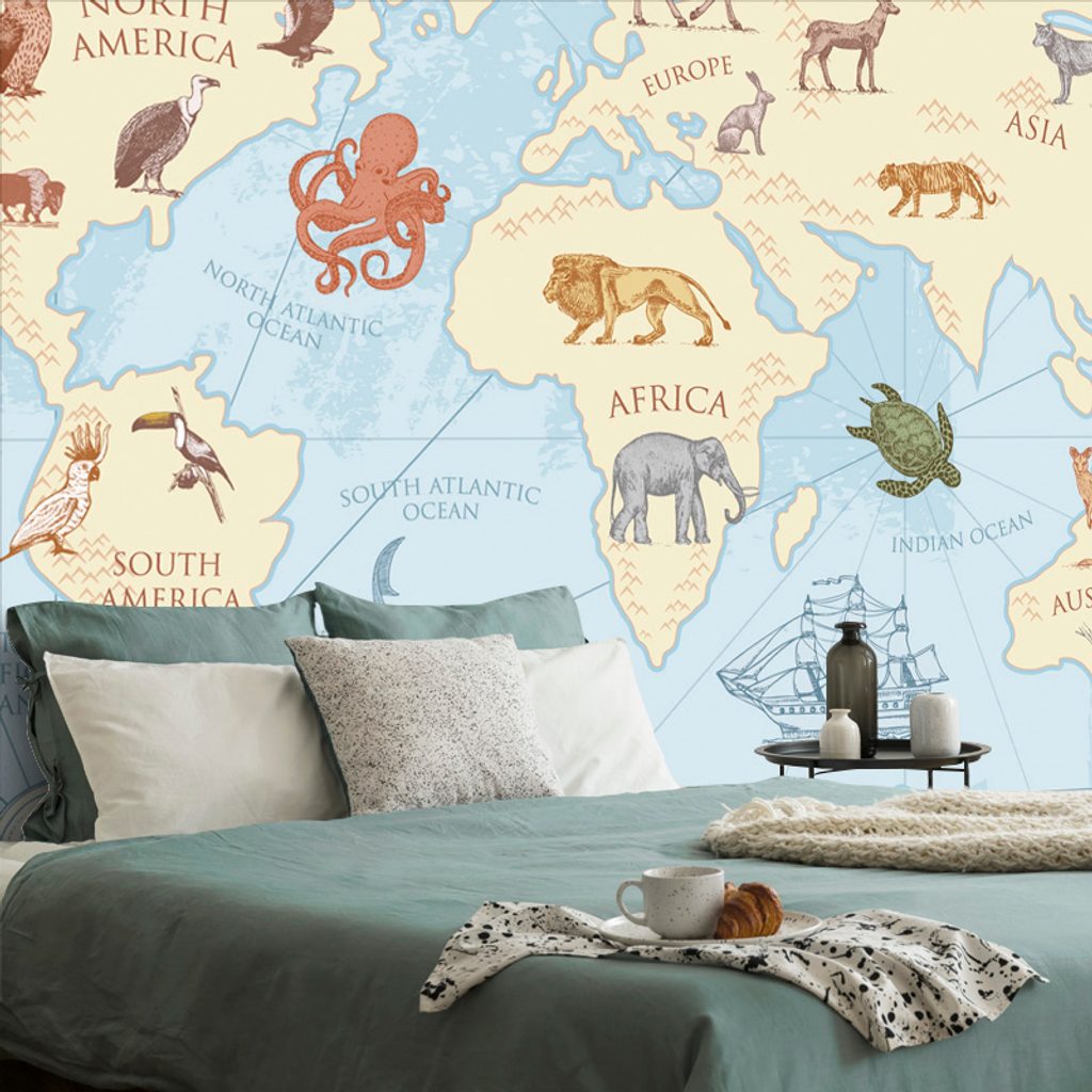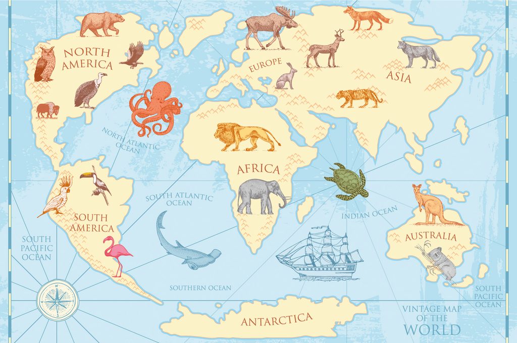 Tapeta kreslená mapa sveta s zvieratami