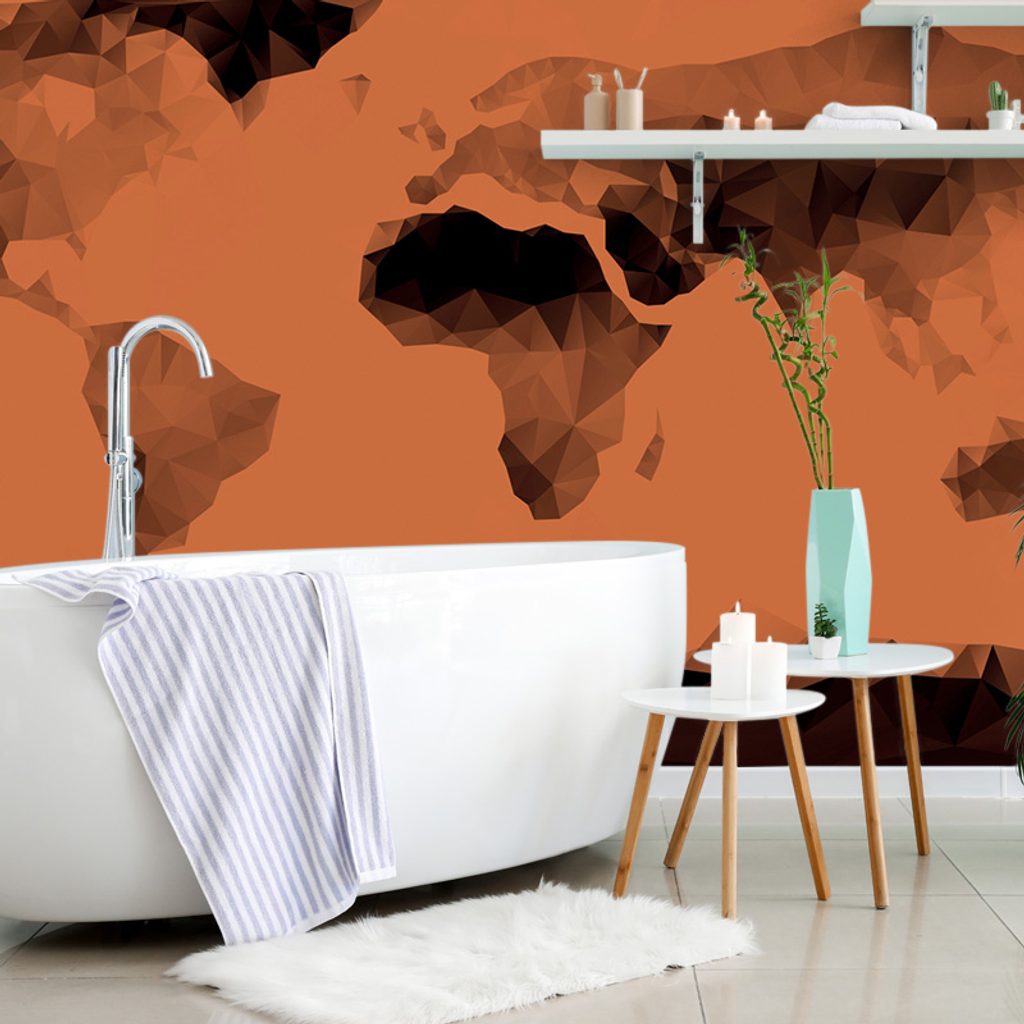 Tapeta mapa sveta tvorená mnohouholníkmi v oranžovom prevedení