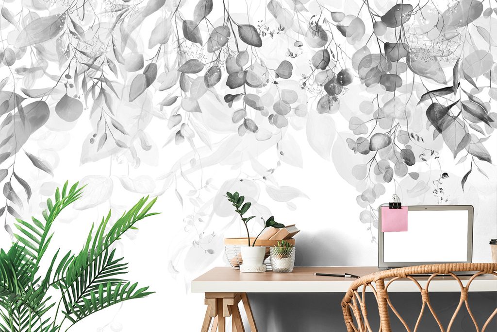 Tapeta nežné listy v čiernobielom prevedení