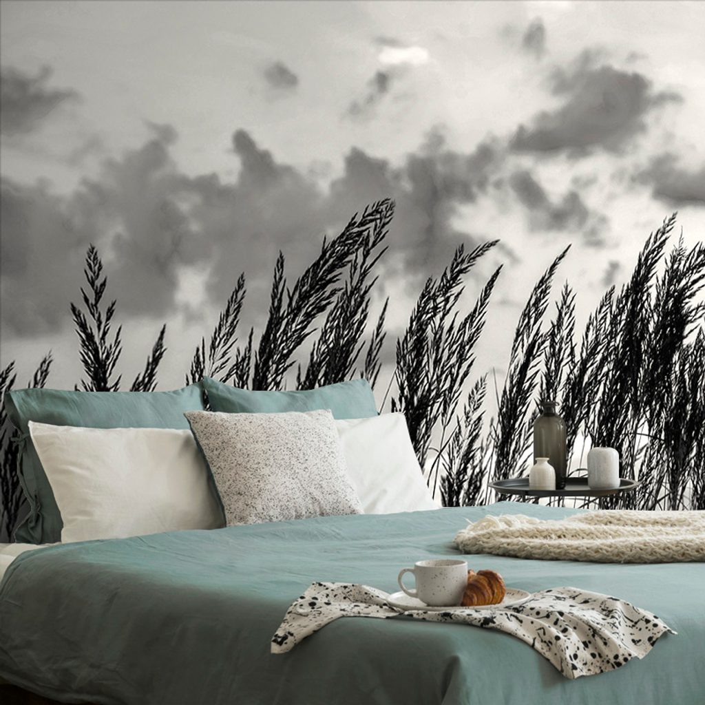 Zaujímavá čiernobiela samolepiaca fototapeta steblá trávy