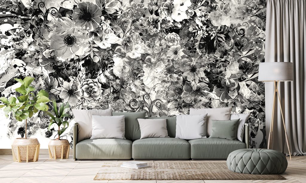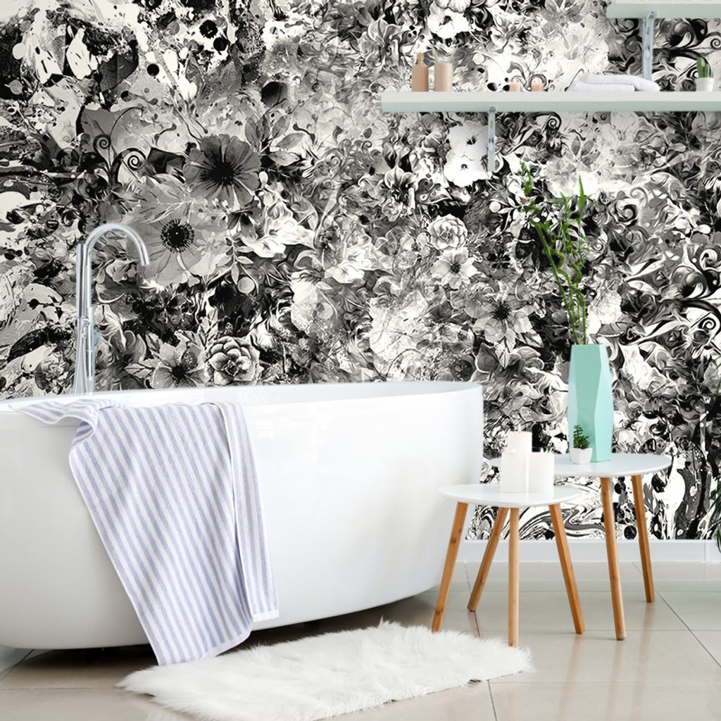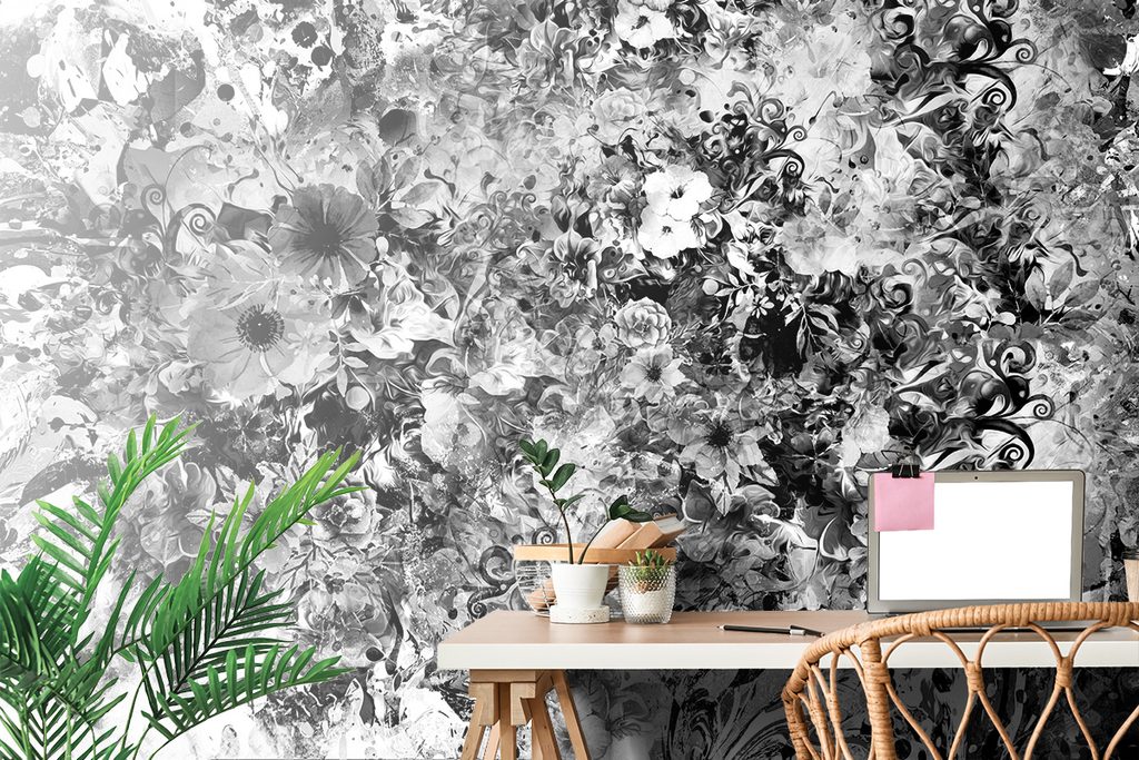 Zaujímavá samolepiaca tapeta rozmanitosť kvetov v čiernobielom prevedení